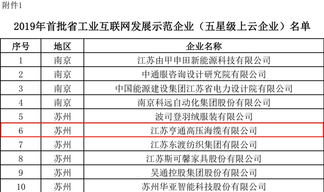 8月19-25日,江苏省工业和信息化厅公示了2019年首批省工业互联网发展示范企业名单(星级上云企业),亨通电力产业集团江苏亨通高压海缆有限公司获评“五星级上云企业”。