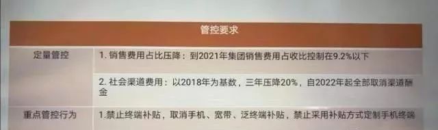 三大运营商将以2018年为基数,社会渠道费用三年压降20%,其中渠道酬金逐年下降20%,自2022年起全部取消渠道酬金。